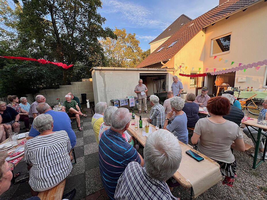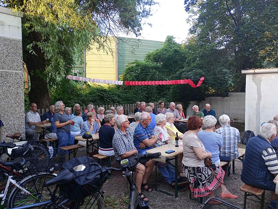 Girlanden und Gladiolen erfreuten das Auge. Um 18:00 Uhr waren schon viele ADFC-Mitglieder gekommen. Der Hof füllte sich; über 45 Personen kamen. Für Gaumenfreuden sorgten zahlreiche selbst gemachte Salate, Ciabatta, Käse, Melone, Putenfleisch, Würstchen, Falafel und weitere auch vegetarische Köstlichkeiten. Für jeden war etwas dabei.
