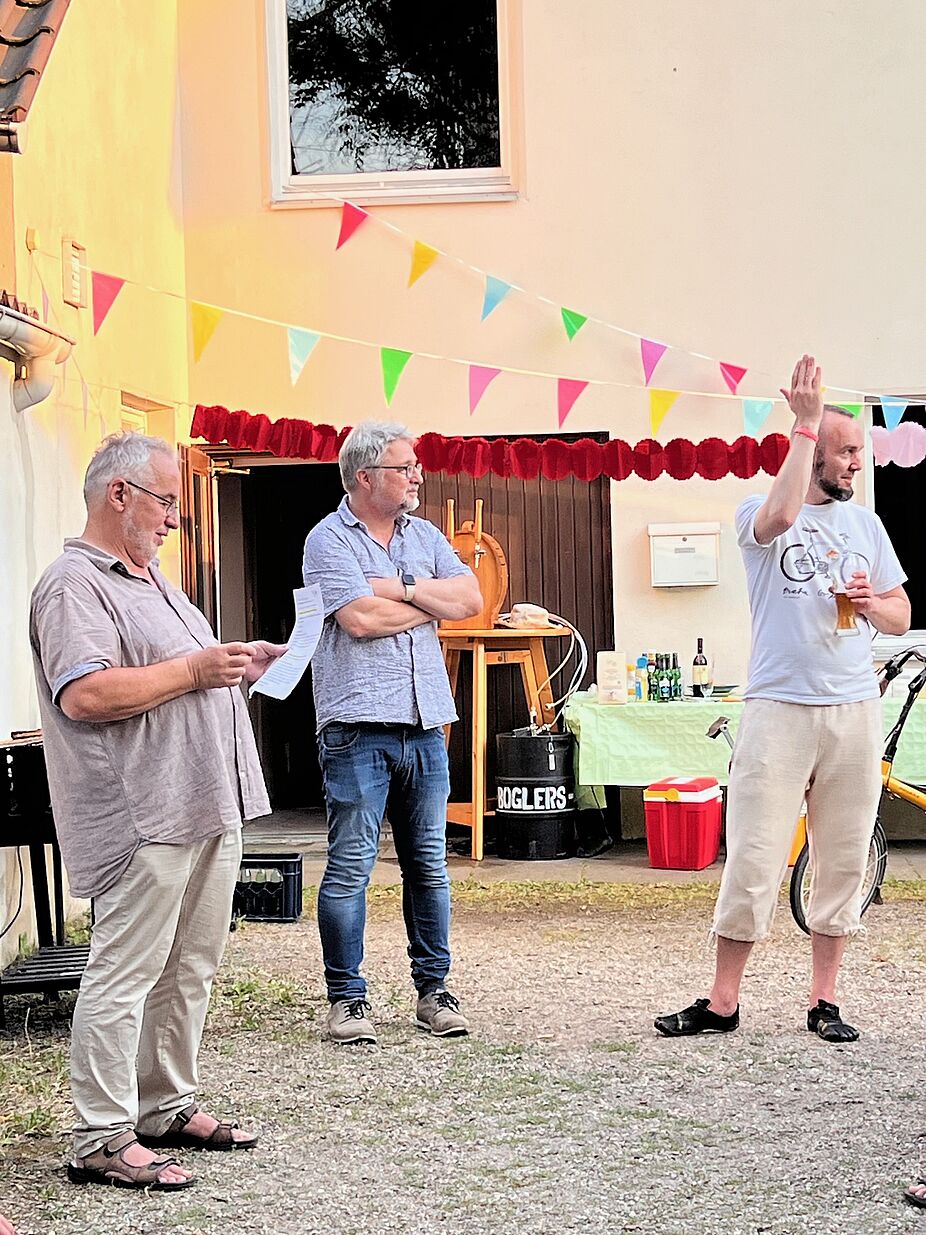 Manfred Hoffmann, Koordinator des Stadtradelns nutzte die Gelegenheit des Grillfestes, um die ADFC-Radelnden zu ehren. In die Pedale wurde vom 26. Mai bis 15. Juni fleißig getreten. Radlerinnen und Radler, die am Stadtradeln teilnahmen, erhielten ein kleines Präsent.