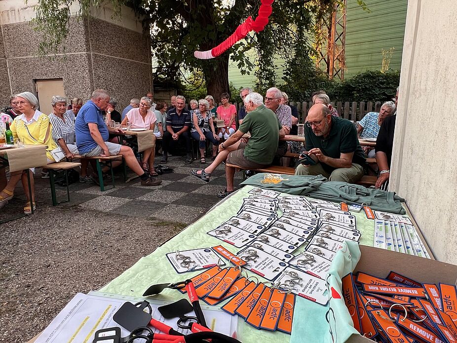Einige anstehende Radtouren wurden noch bekannt gegeben. In den Gesprächen an den Tischen wurde begeistert von wunderbaren Radtouren und mehrtägigen Fahrradreisen berichtet. Gegen 21:00 Uhr gingen viele Leute fröhlich nach Hause. Das Aufräumen machte mit motivierten Helferinnen und Helfern richtig Spaß und schnell waren die Tische, Getränkekisten und so allerlei Kleinkram wieder am richtigen Platz.