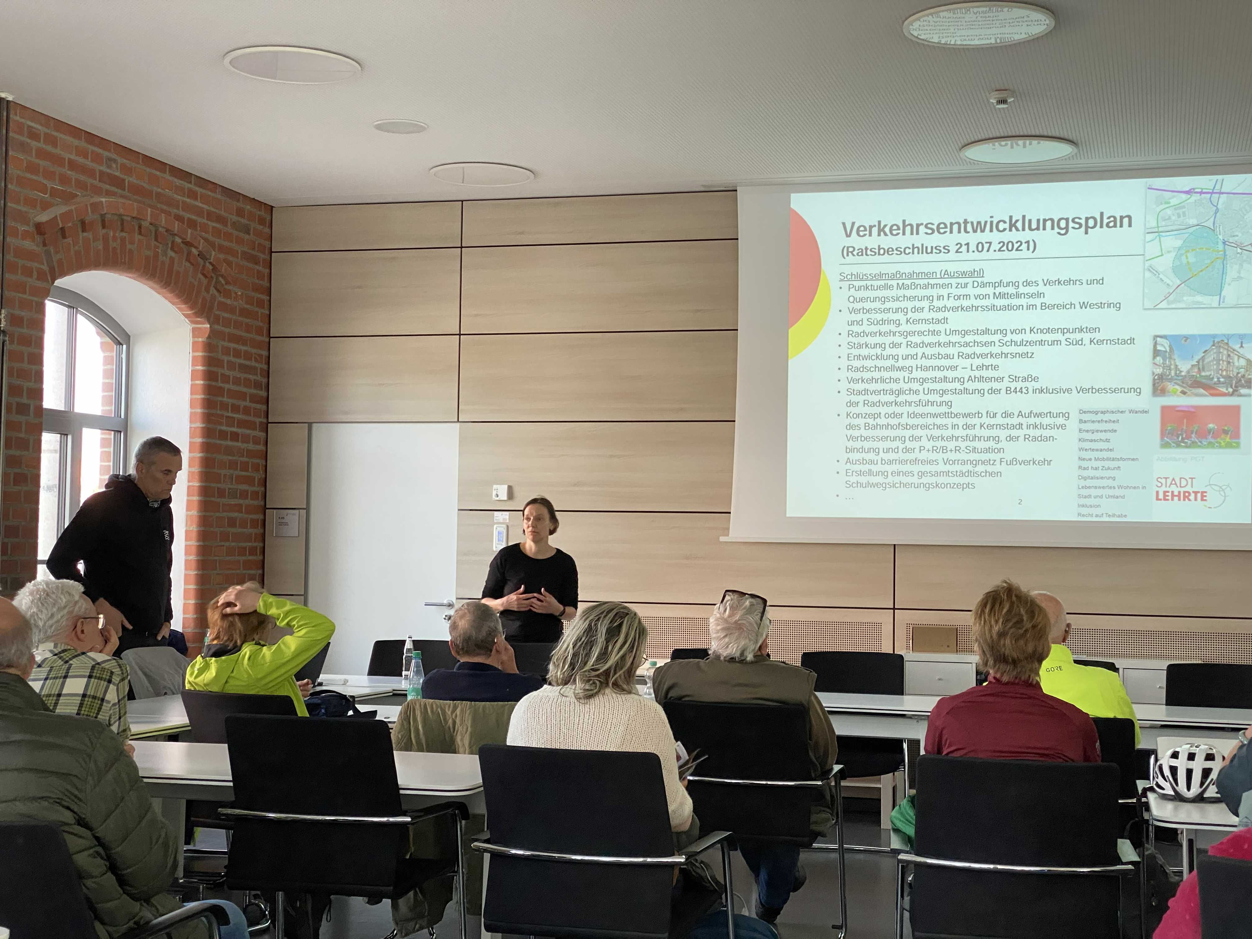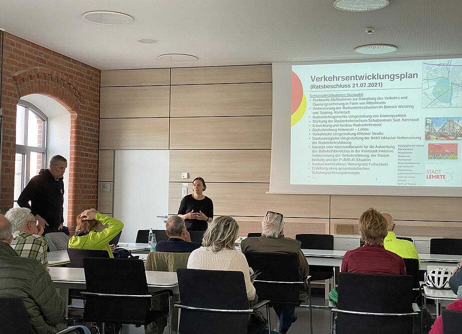 Im Anschluss an die Tour trafen sich die Radelnden bei den Stadtwerken. Wiebke Schepelmann und Conrad Vinken stellten aktuelle Planungsstände und weiterführende Ideen vor. Anschließend gab es eine rege Diskussion über die zukünftige Radverkehrsentwicklung in Lehrte.